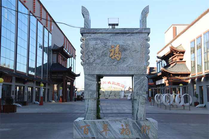 “福墻”:位于福街中央大街西廣場,群雕整體重300多噸,岫巖青玉上精心雕刻99個不同字體的“?!弊?,是中國最大的“?!弊謮?。“福墻”又稱“百福林”,寓意福澤綿長。